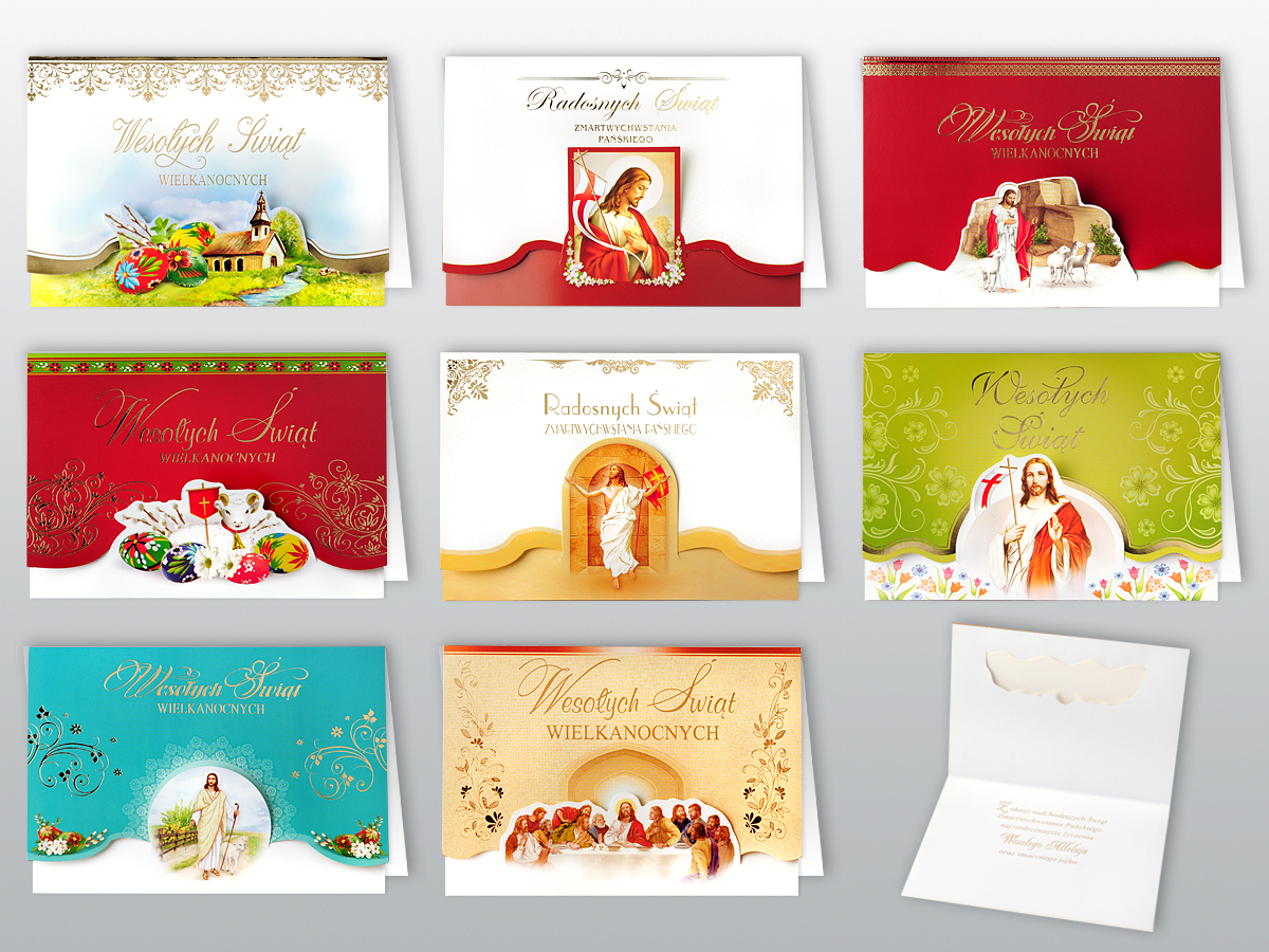 – koperta w zestawie – złocone elementy graficzne- wnętrze karnetu z tekstem życzeń- lakier powierzchniowy UV- wykrojnik zarówno do karnetu jak i wkładki założonej na przednią stronę karnetu