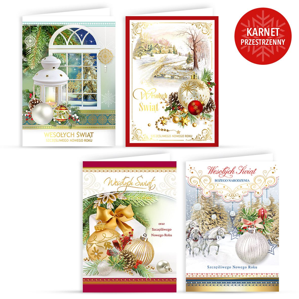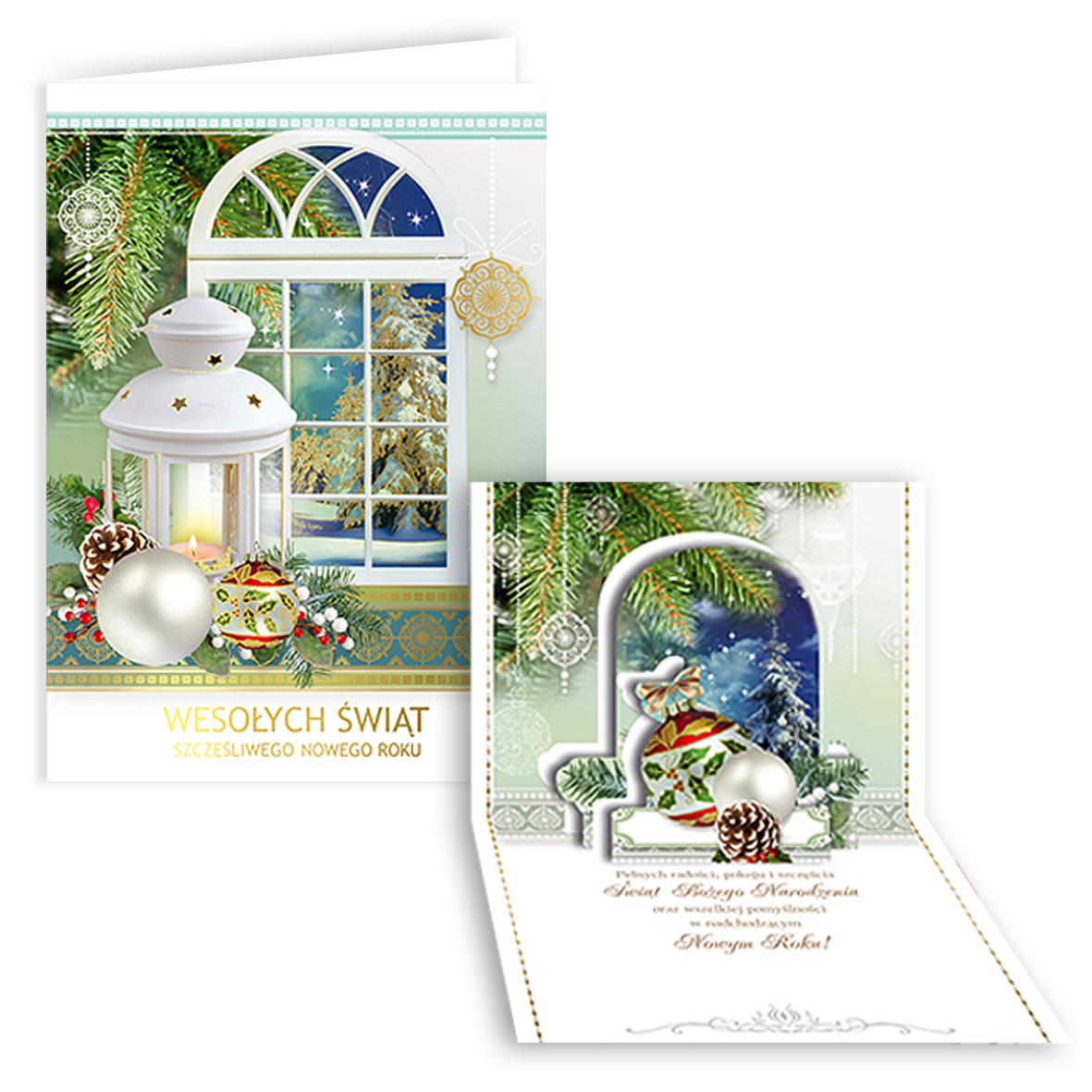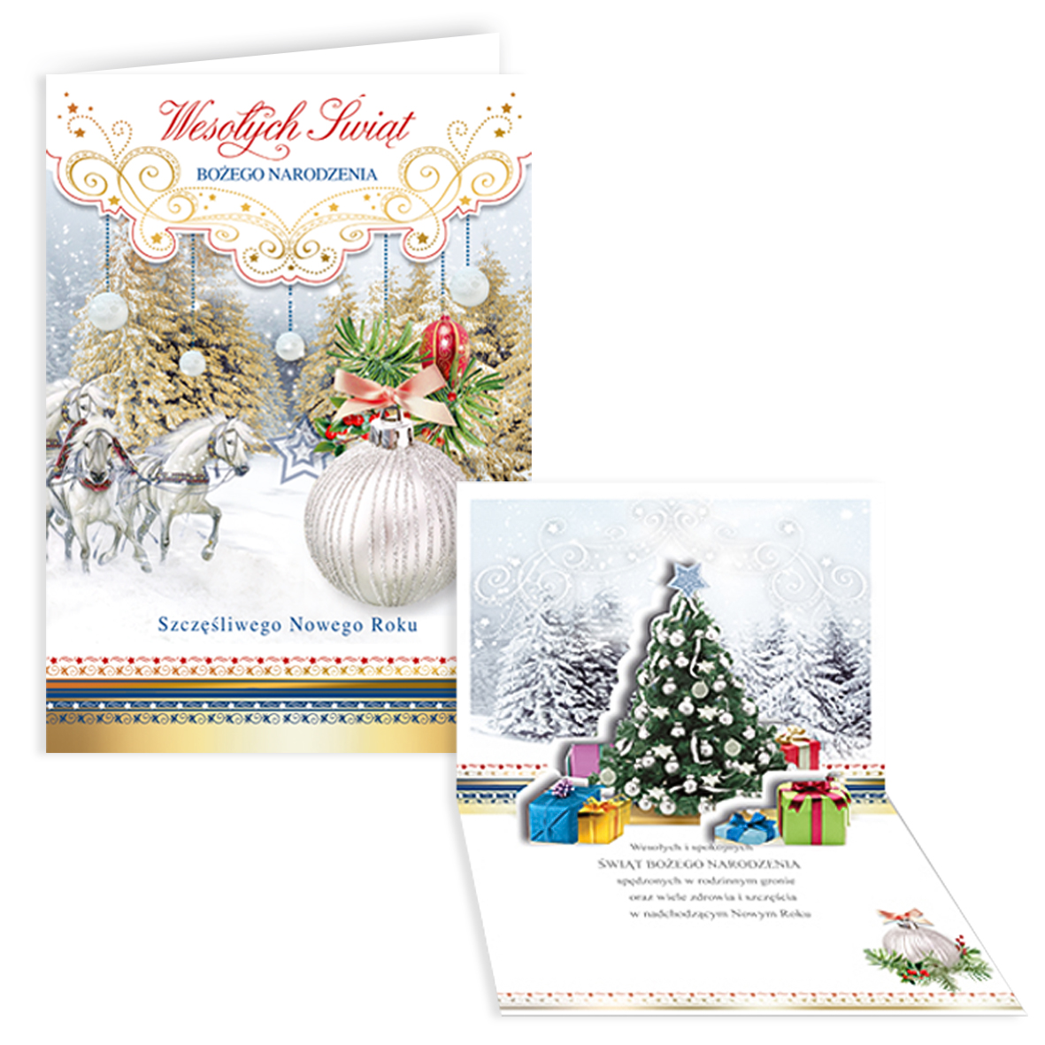 Elegancki karnet świąteczny o wyjątkowym, przestrzennym charakterze. Wykonany z wysokiej jakości papieru, ozdobiony złoconymi elementami graficznymi, które subtelnie połyskują w świetle, nadając całości wyjątkowego blasku i świątecznej elegancji.