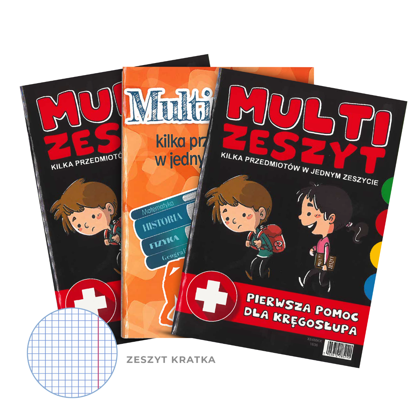 Multizeszyt – kilka przedmiotów w jednym zeszycie. Zeszyt posiada 4 kolory marginesów do podziału przedmiotów