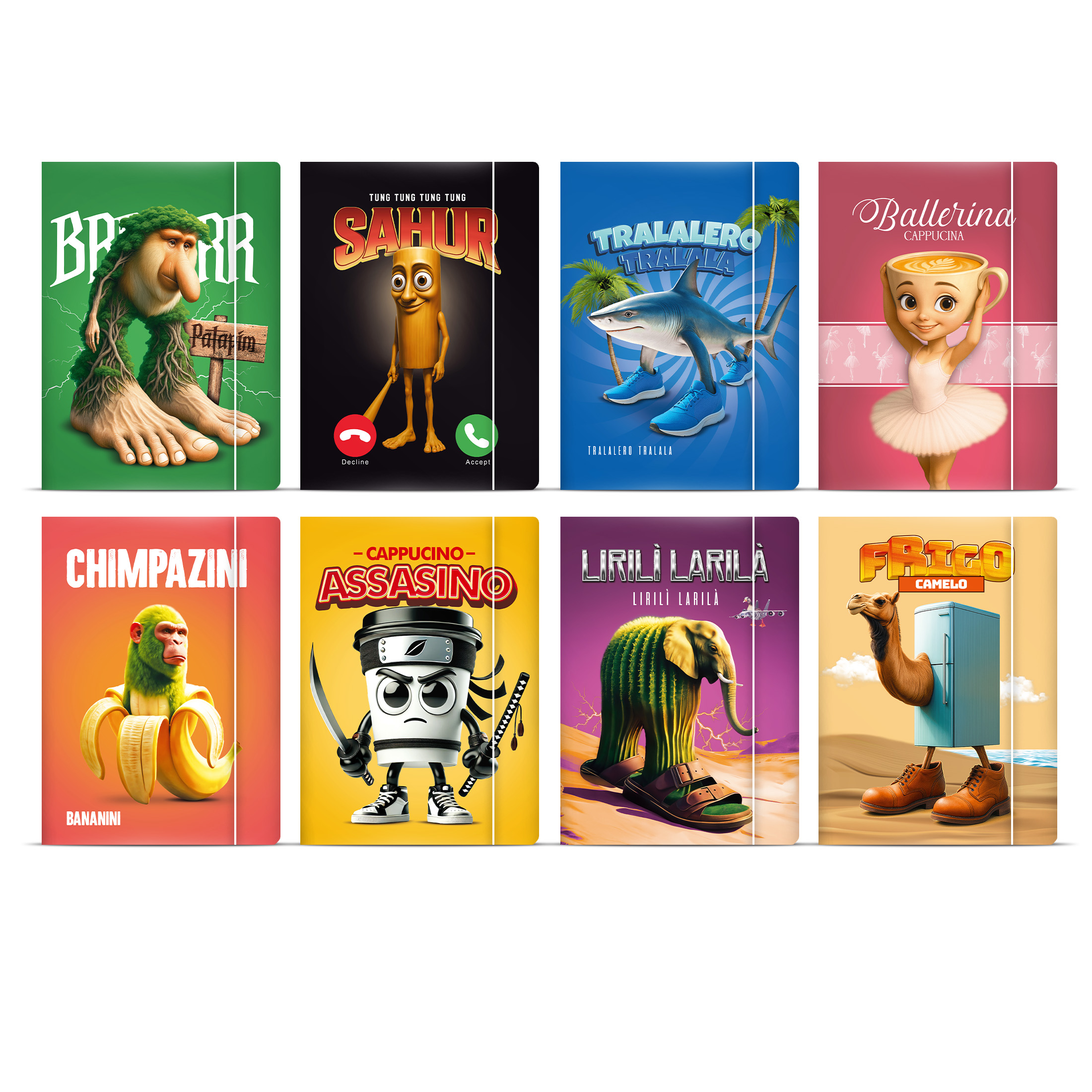 | Wzór: | BRRR PATAPIM, SAHUR, TRALALERO TRALALA, BALLERINA CAPUCCINA, CHIMPAZINI BANANINI, CAPUCCINO ASSASINO, LIRILI LARILA, FRIGO CAMELO |