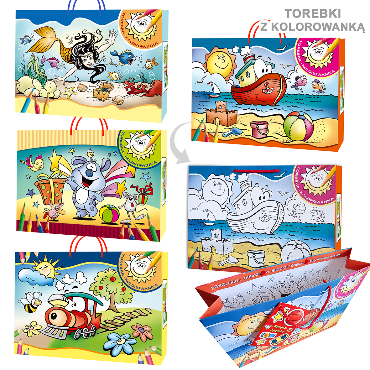 - – torebka z kolorowankami na zewnętrznej i wewnętrznej stronie