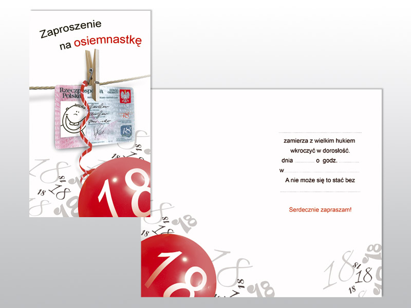 Zaproszenie na 18-stkę:- druk na papierze o podwyższonym poziomie bieli- lakier UV wybiórczy- tłoczone elementy graficzne- kolorowy środek zaproszenia z tekstem Nr wzoru: 02110-07841 opakowanie zawiera:- 5 szt. zaproszeń- 5 szt. kopert
